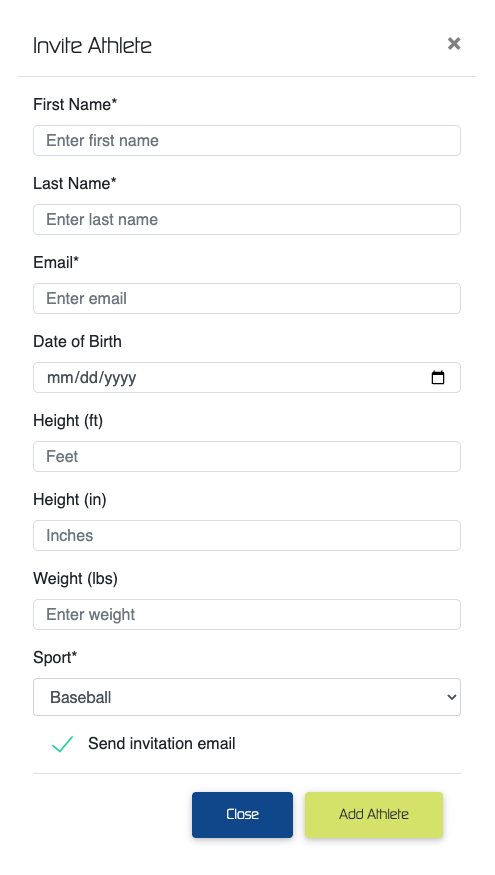 Whenever you are adding athletes to the Pelotero Platform, you will have the option of 'Sending Athlete Invitation' upon completion.