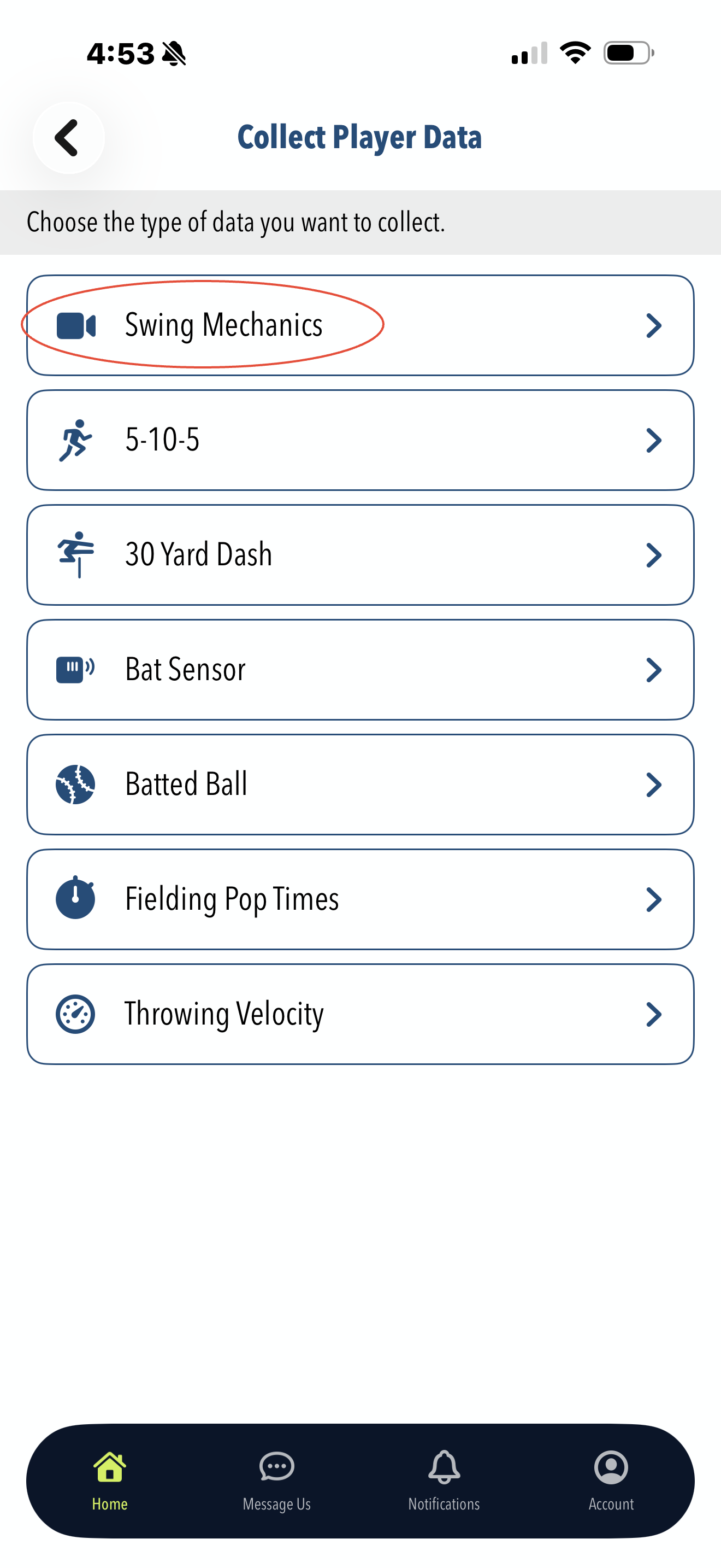 In the following menu, you will choose the type of data you'd like to collect. In this case, when we'd like to upload swing video, we'll be choosing 'Swing Mechanics'