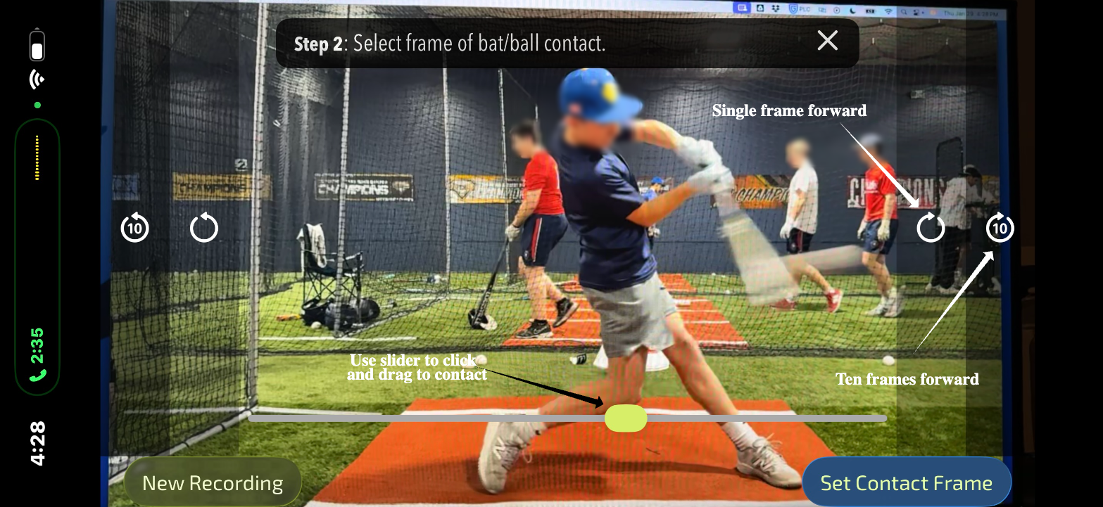 After capturing the swings and stopping the recording, you'll be asked to set the contact frame for the swing that you choose to upload. You can click and drag on the slider and then use the buttons on the right and left of the screen to move 1 or 10 frames at a time, to get the ball and bat as close to contact as possible. Once you've arrived at the contact frame, click the 'Set Contact Frame' button in the bottom right.