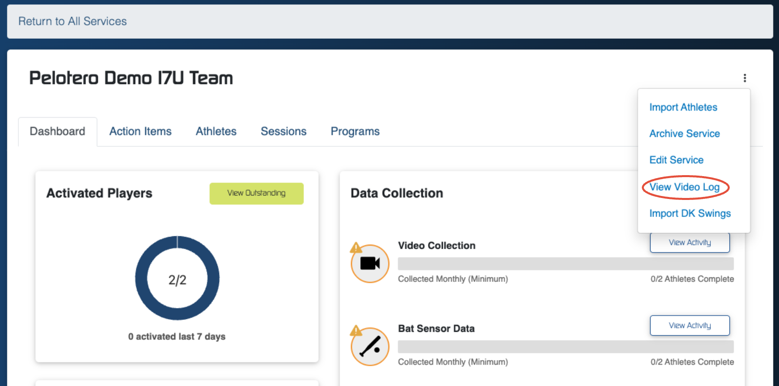 In order to verify that your videos are processing, you can check the video log for each individual service within Pelotero. To access the Video Log, you must enter your service and click on the three dot menu on the right of the screen.