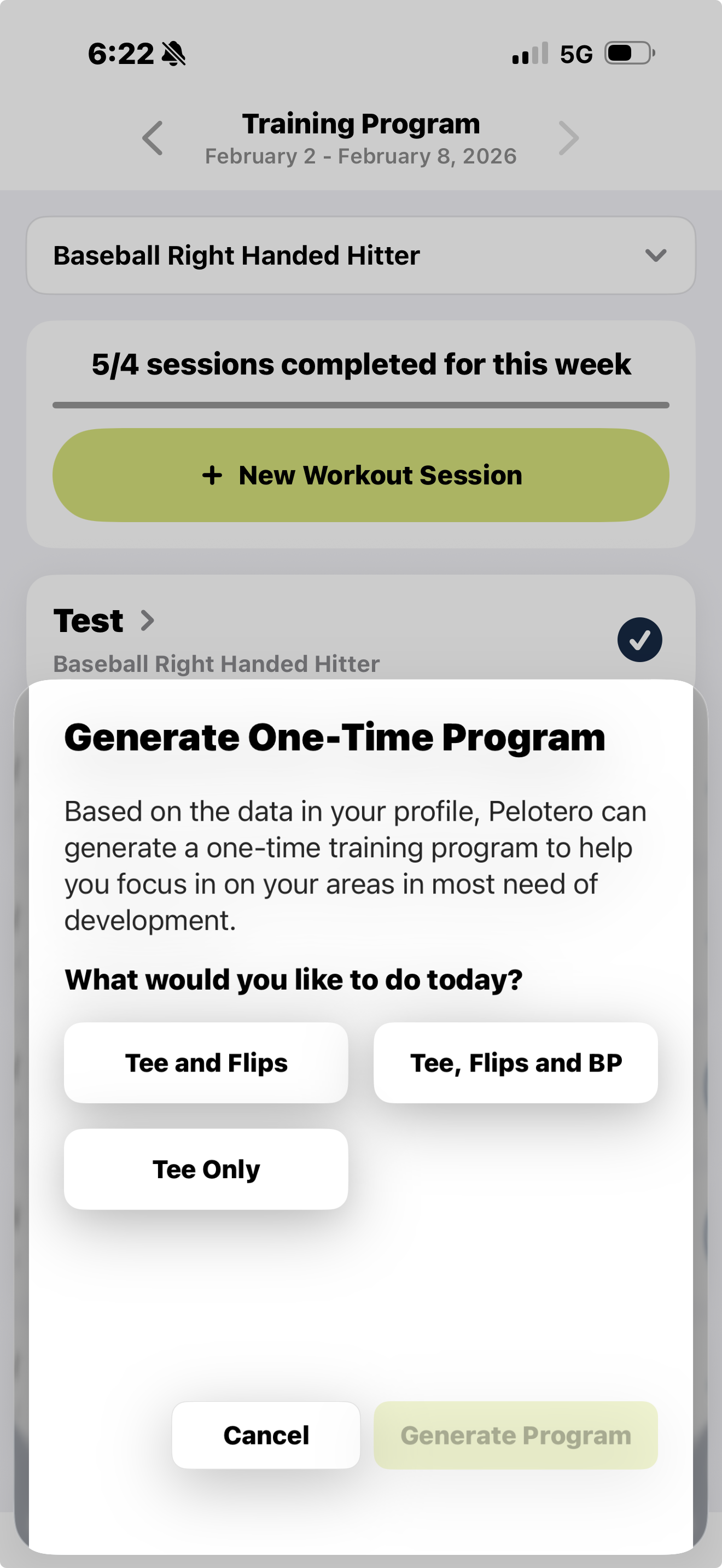 ***Example: Imagine a player is at home and has finished their workouts for the week but wants to hit again. They can choose 'New Workout Session' > 'Generate One-Time Workout' > 'Tee Only' > 'Generate Program' and a fully customized plan will be built in seconds.