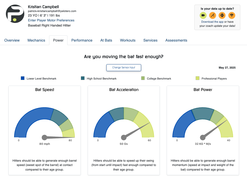 The power tab is reserved for a player's output data. If bat sensor data has been collected, players will see three main categories where they will be benchmarked against the industry.