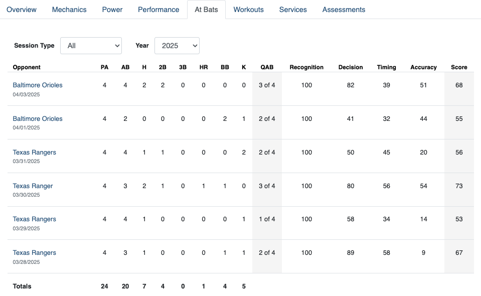 The At Bats tab is where players can go to review individual games which they have logged. Each game will have a score for the various game categories. Players will be able to have a great understanding of how they performed in any given game, regardless of the outcomes of their at bats.