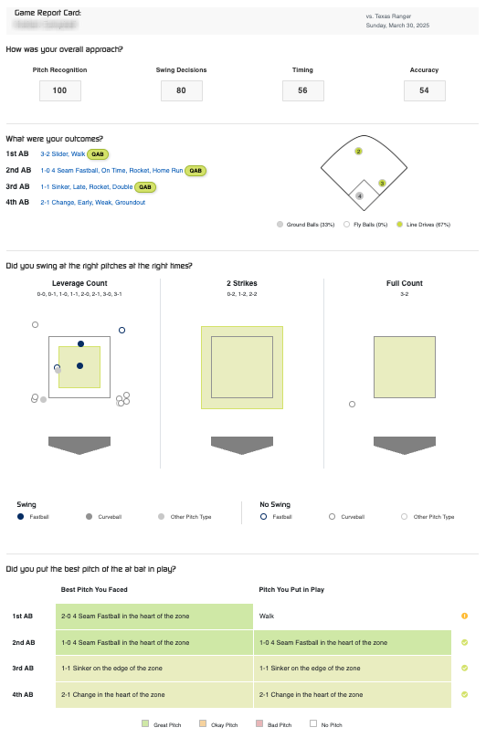 Our process based stats like Pitch Recognition, Timing, Accuracy and Swing Decisions will be scored independently, and we will also grade the game based on a player's run expectancy for each at bat. Those report cards will be shared instantly with players and coaches.