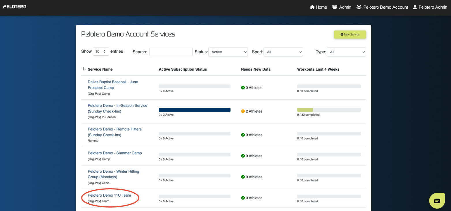 Navigate to the Service Name list and select the specific team or camp you wish to manage (e.g., "Pelotero Demo 17U Team").