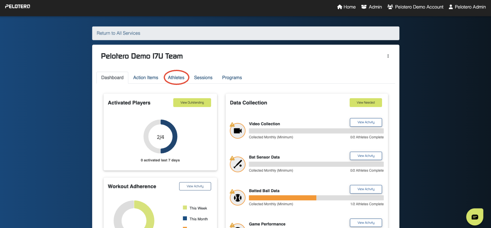 Once inside the service dashboard, click on the Athletes tab located in the top navigation menu.