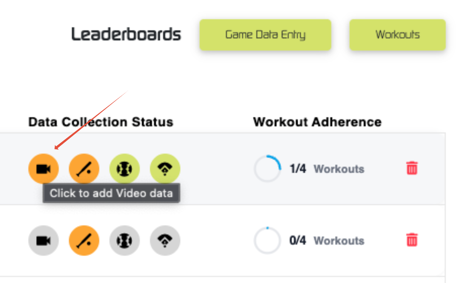 In the Data Collection Status column, hover over the icons until you find the one labeled "Click to Add Video Data".