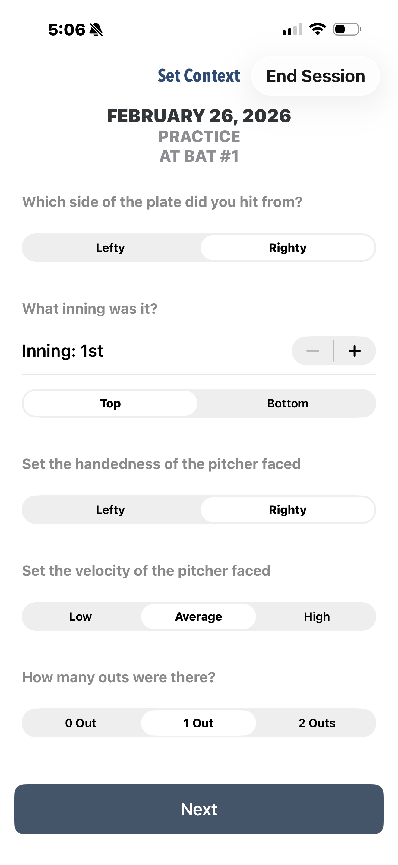 Select "Done with Session" to finish or "Add Another At Bat" to continue.