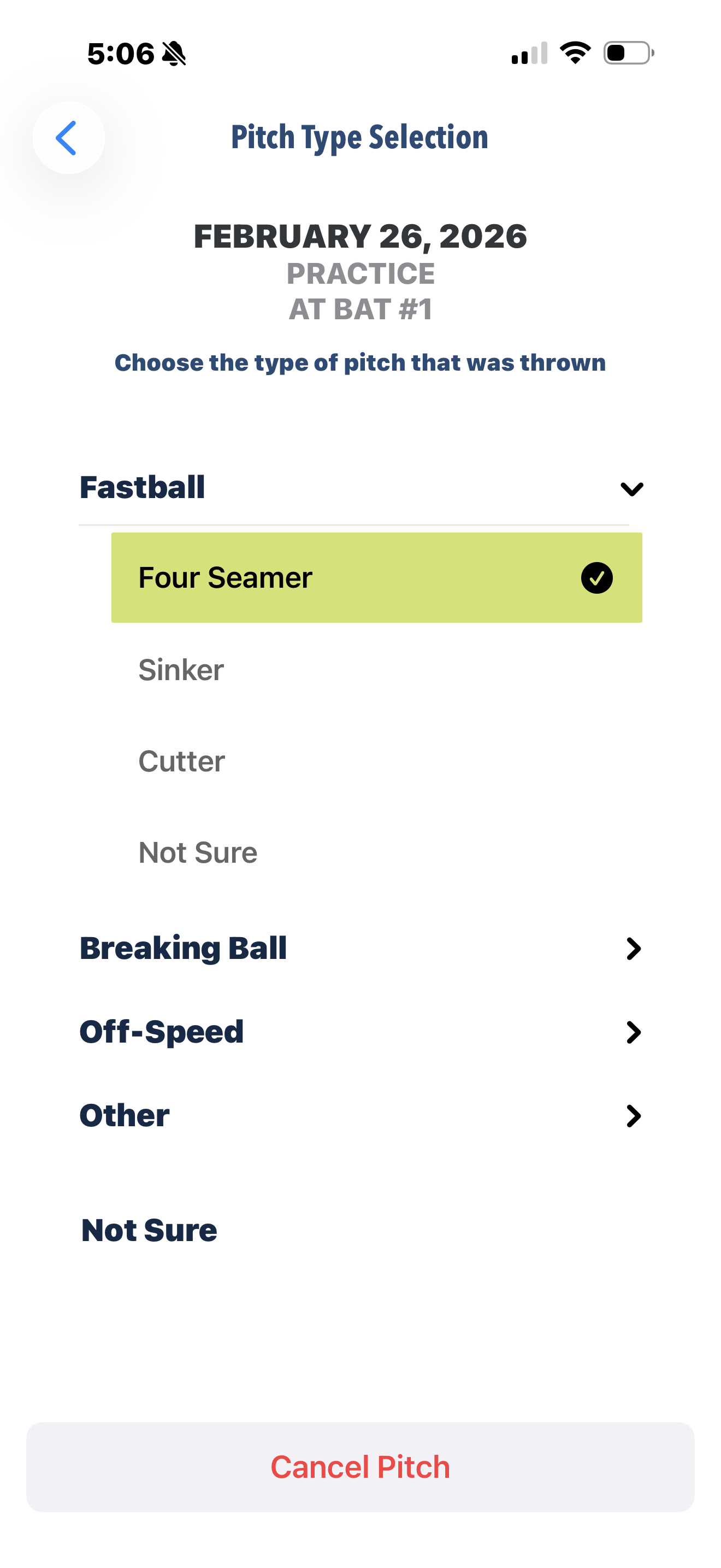 Type: Select the category (Fastball, Breaking Ball, etc.) and specific pitch (e.g., Sinker, Curveball).