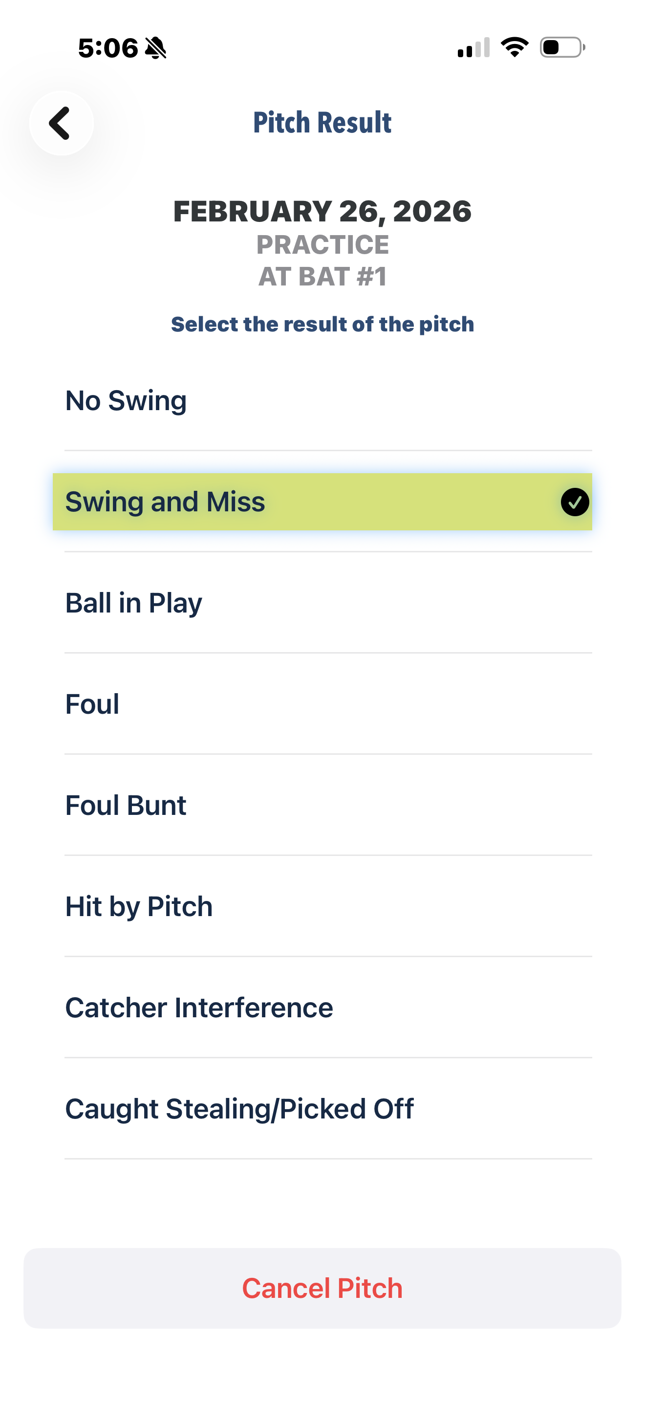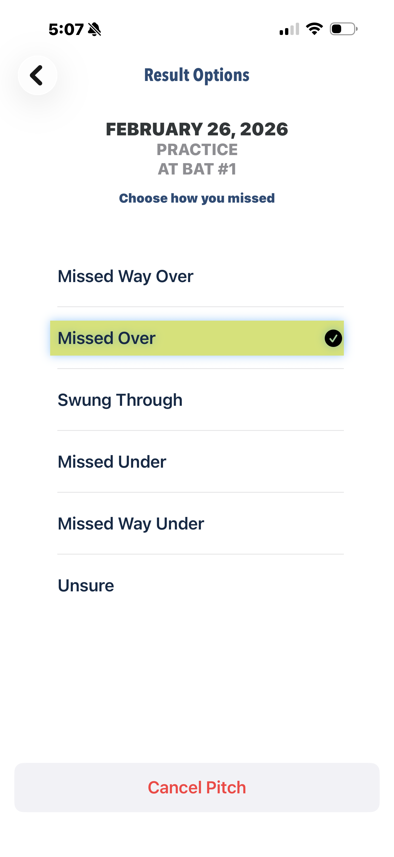 Result: Mark the outcome, such as a "Take," "Foul," or "Swing and Miss." If you missed, specify if you were over, under, or through the ball, and how your timing was on the swing (Late, on time, early, etc.)