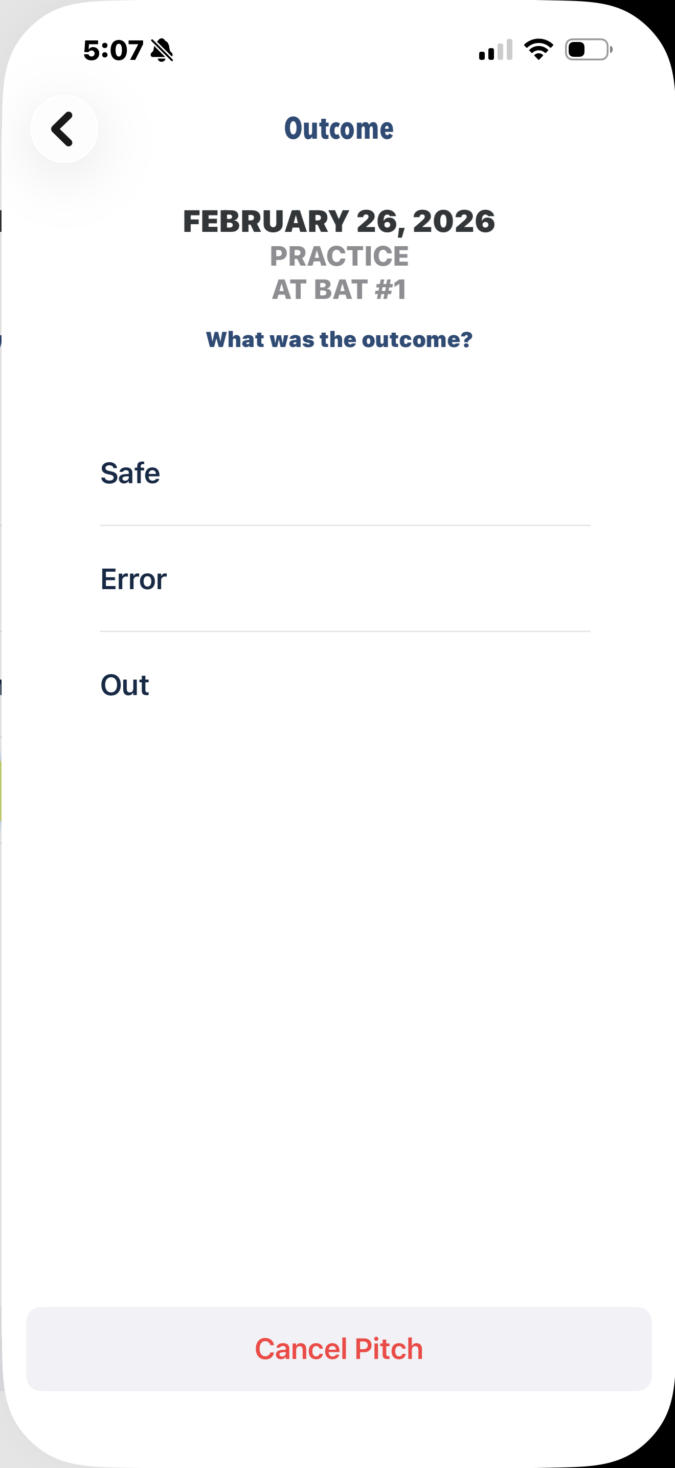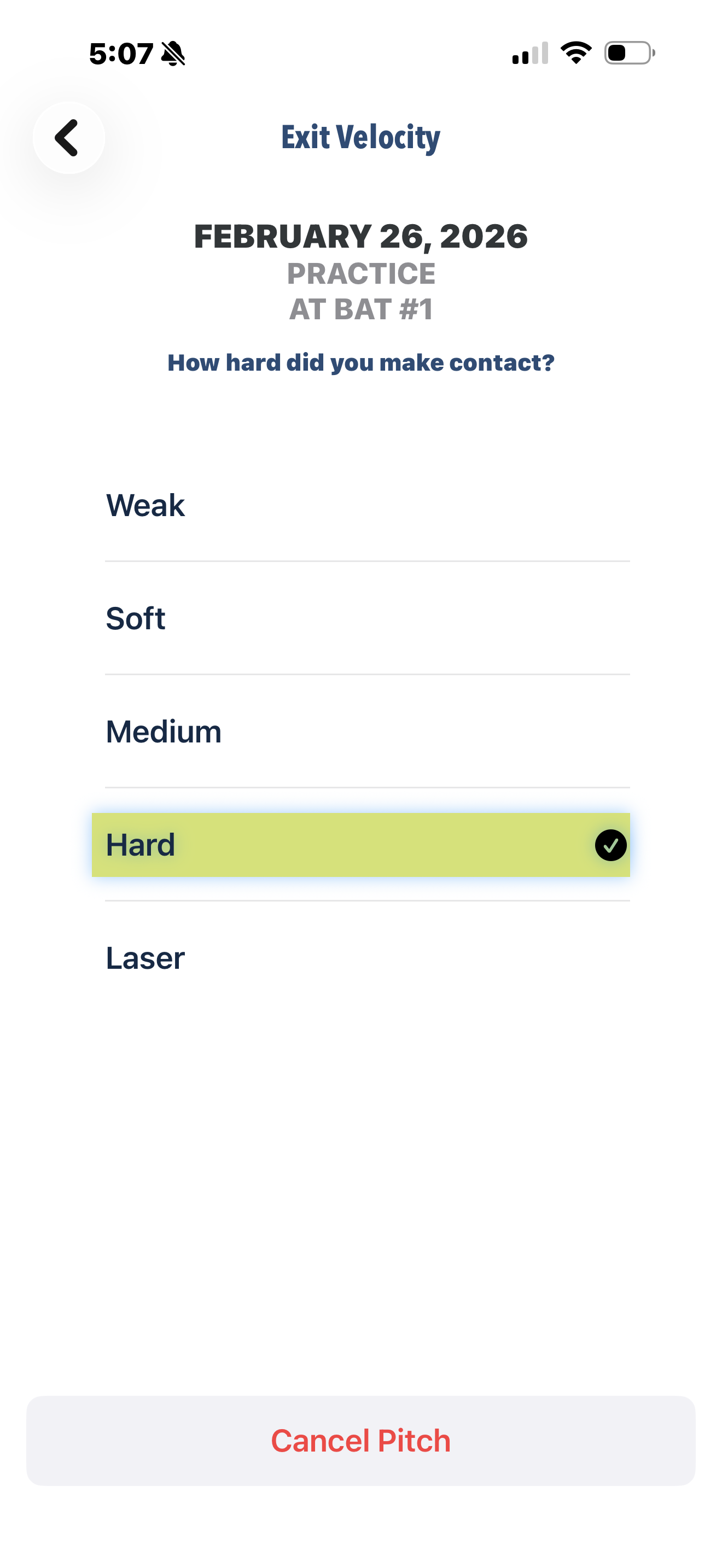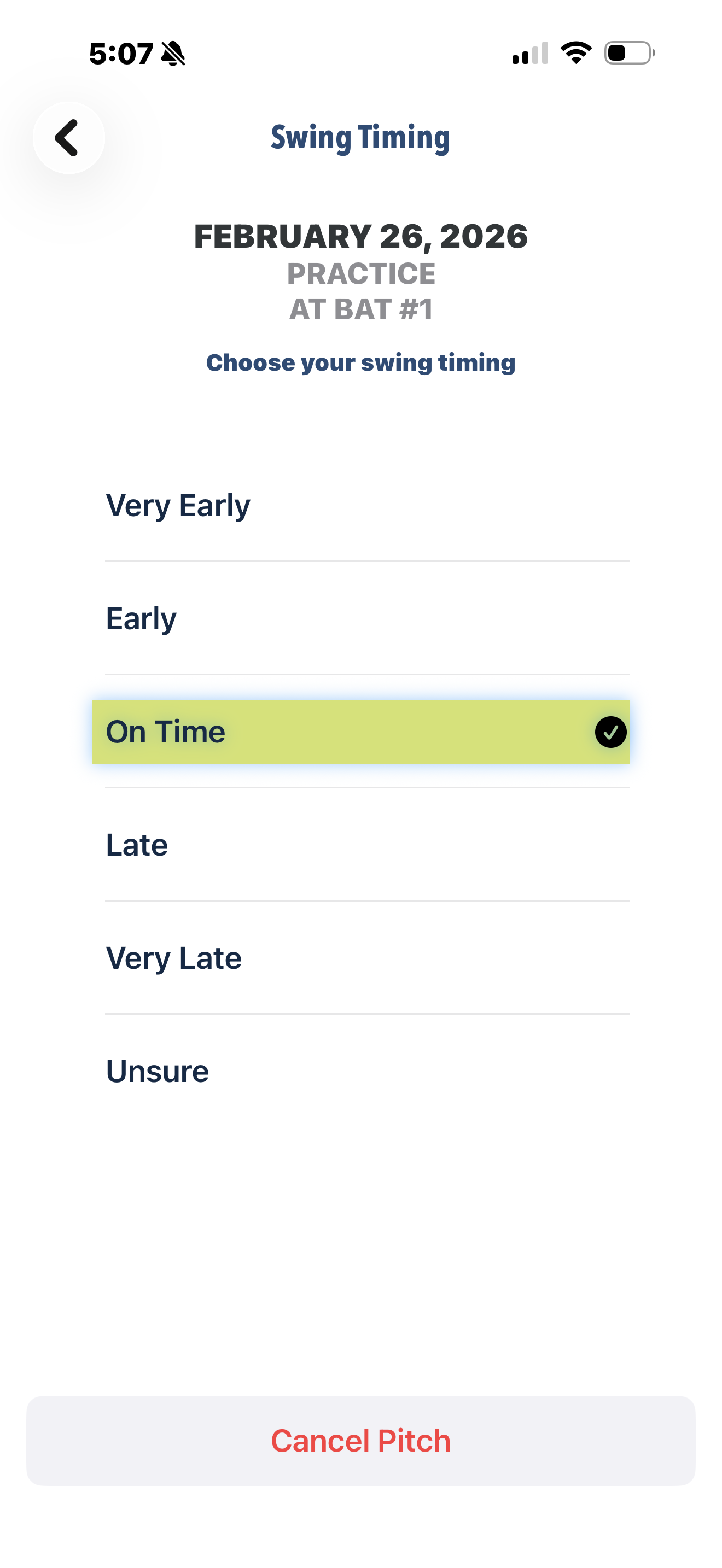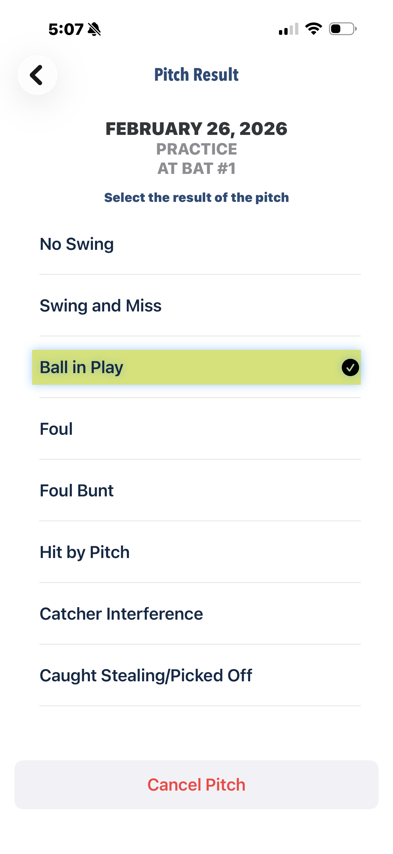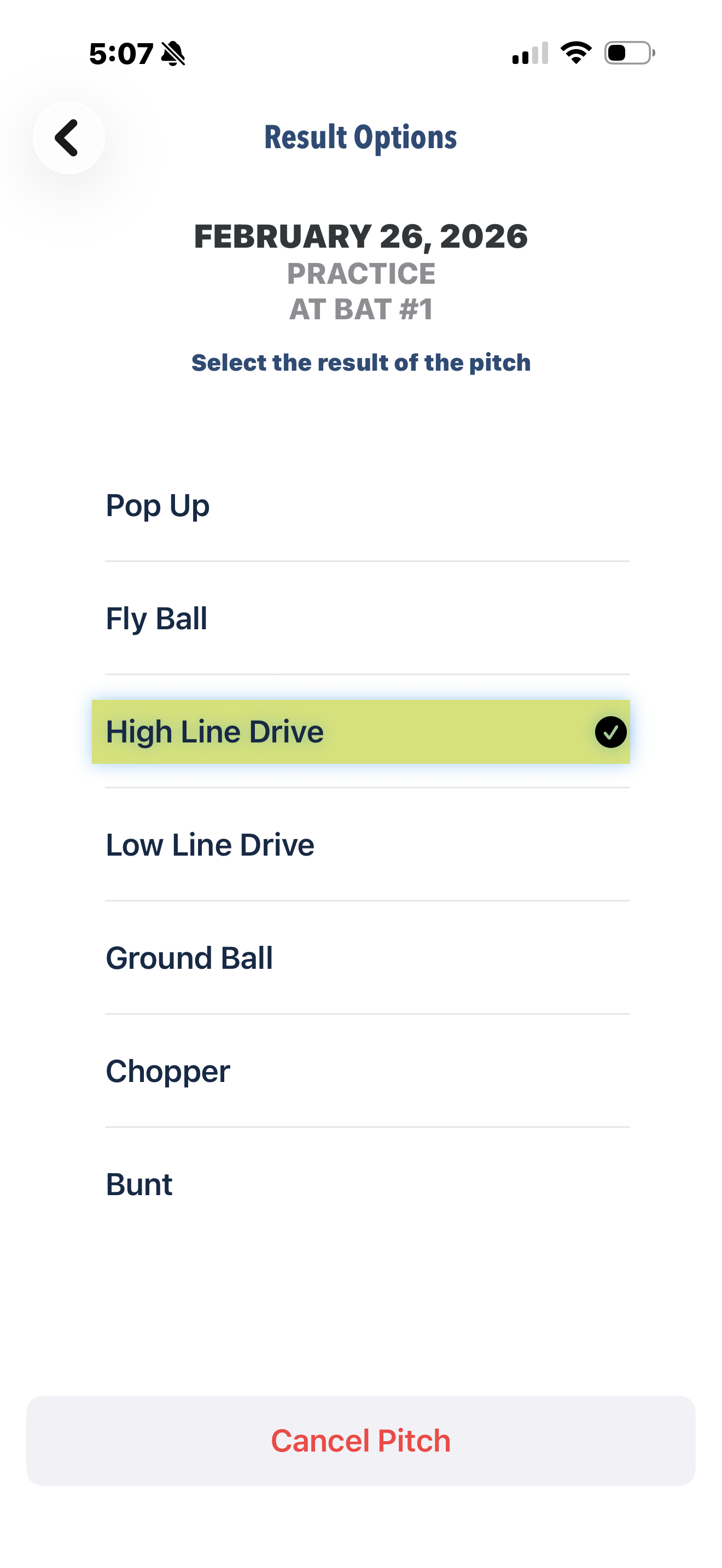 If the ball is put in play, log the Hit Type (e.g., Ground Ball, Line Drive) and your Swing Timing.