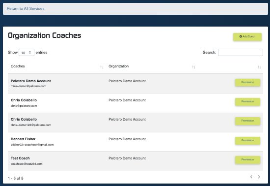 Figure 10: Organization Coaches — coach roster with permission management